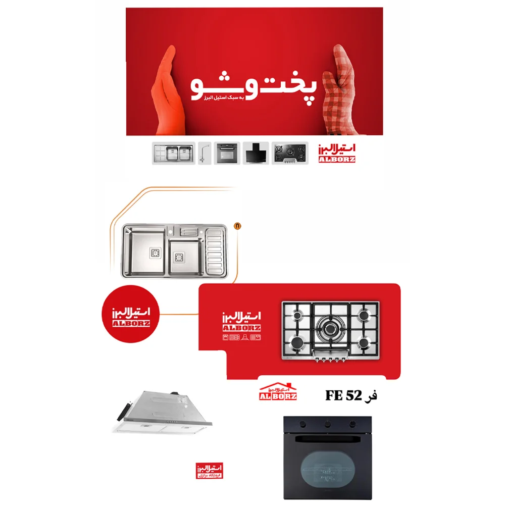 • فر توکار مدل FE 52: یکی از محبوب‌ترین فرهای برقی استیل البرز با برنامه‌های پخت متنوع و مصرف انرژی بهینه.